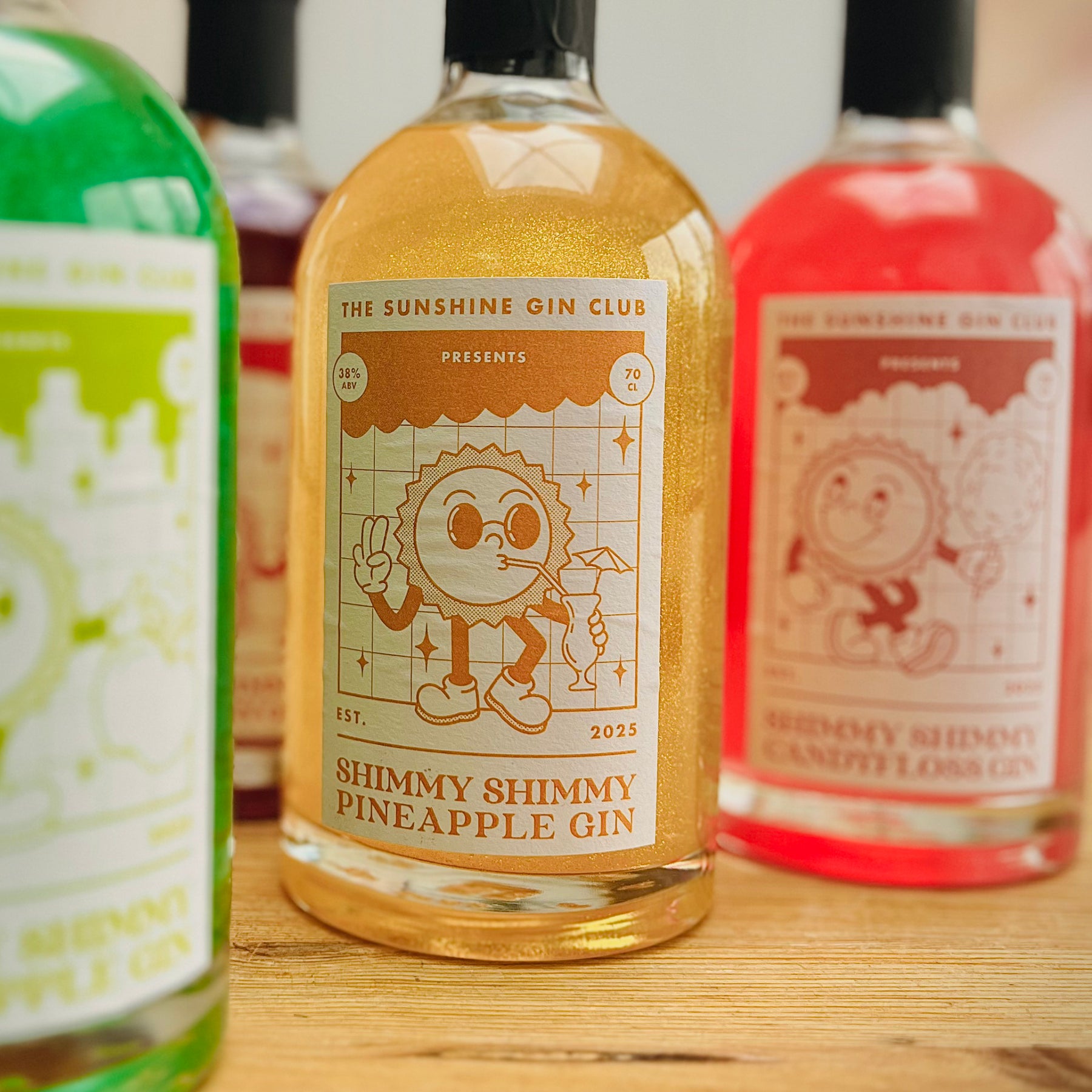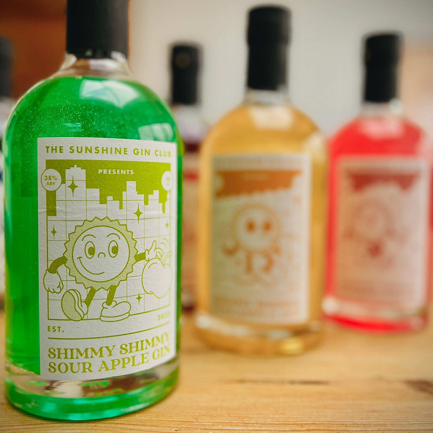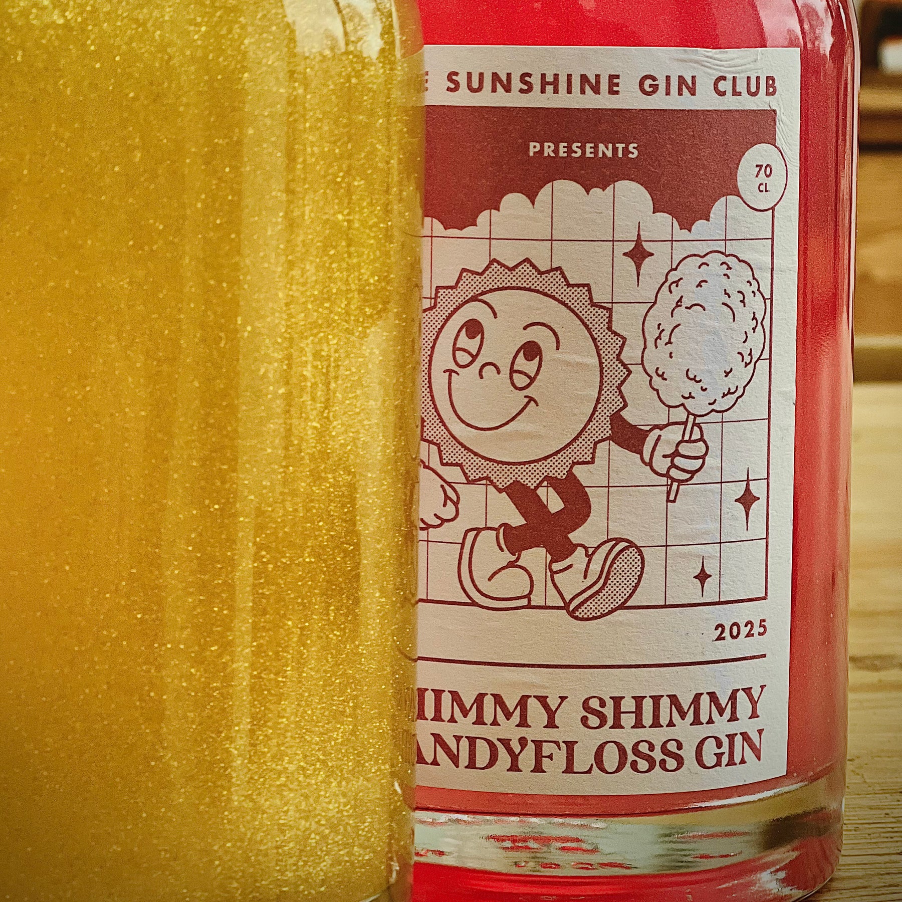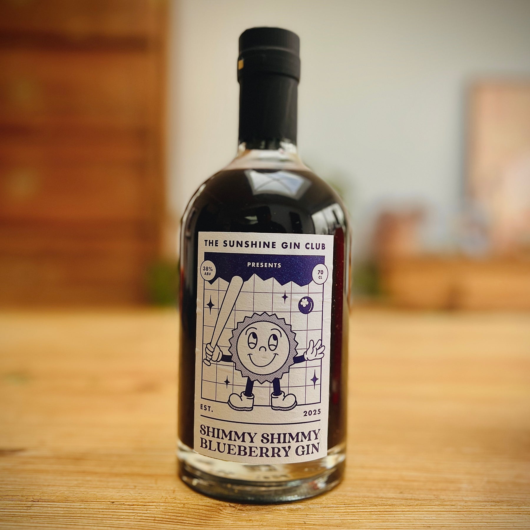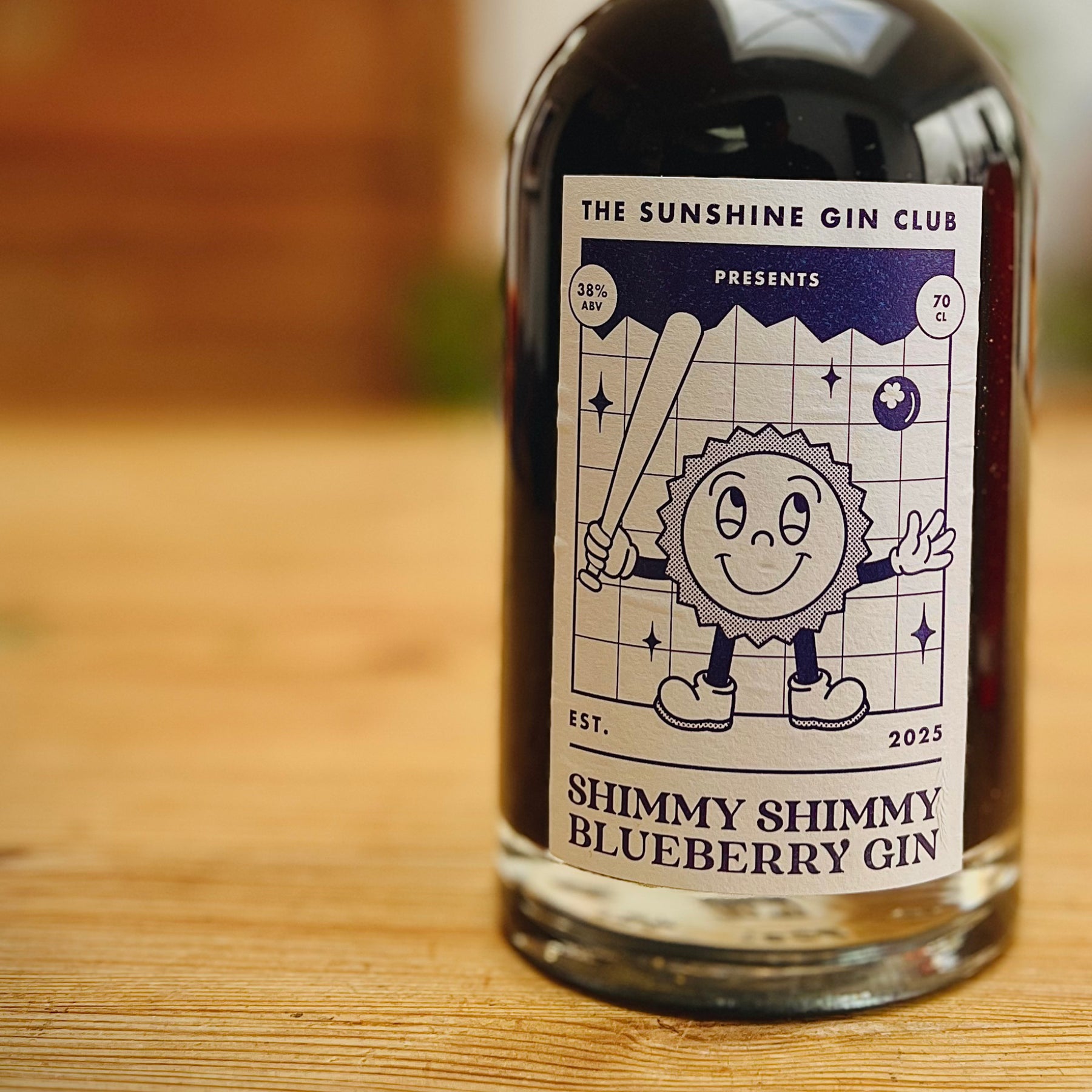 Bottle of Shimmy Shimmy Blueberry Gin from The Sunshine Gin Club on a wooden surface.